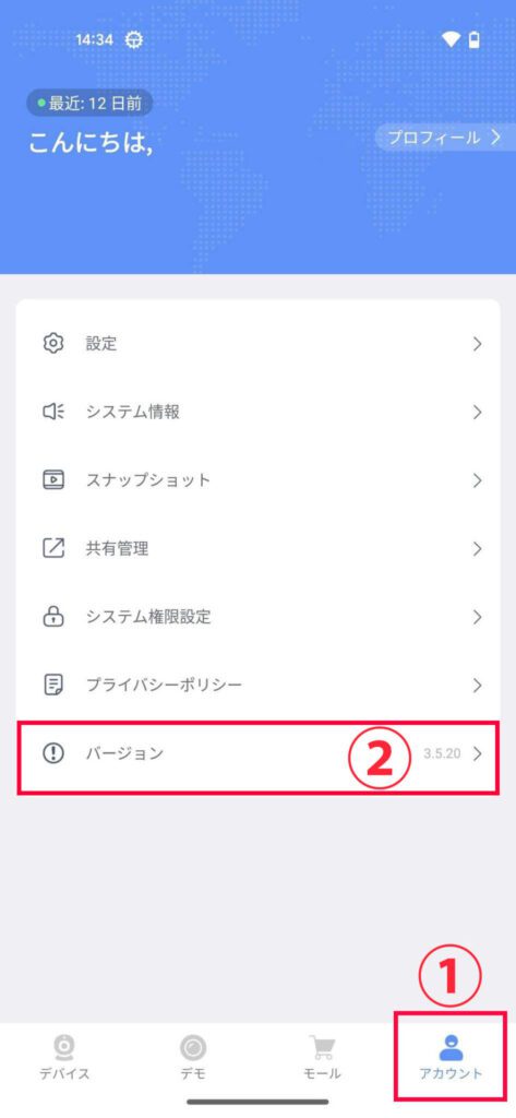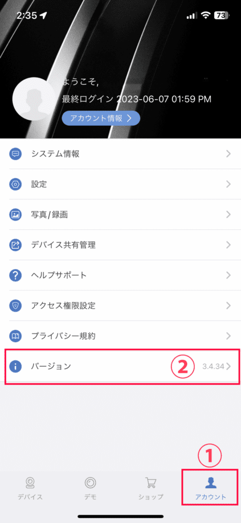 アプリホーム画面「アカウント」→「バージョン」よりご確認いただけます。 ※ご使用いただいているスマートフォンにより表示が異なりますのでご注意ください。