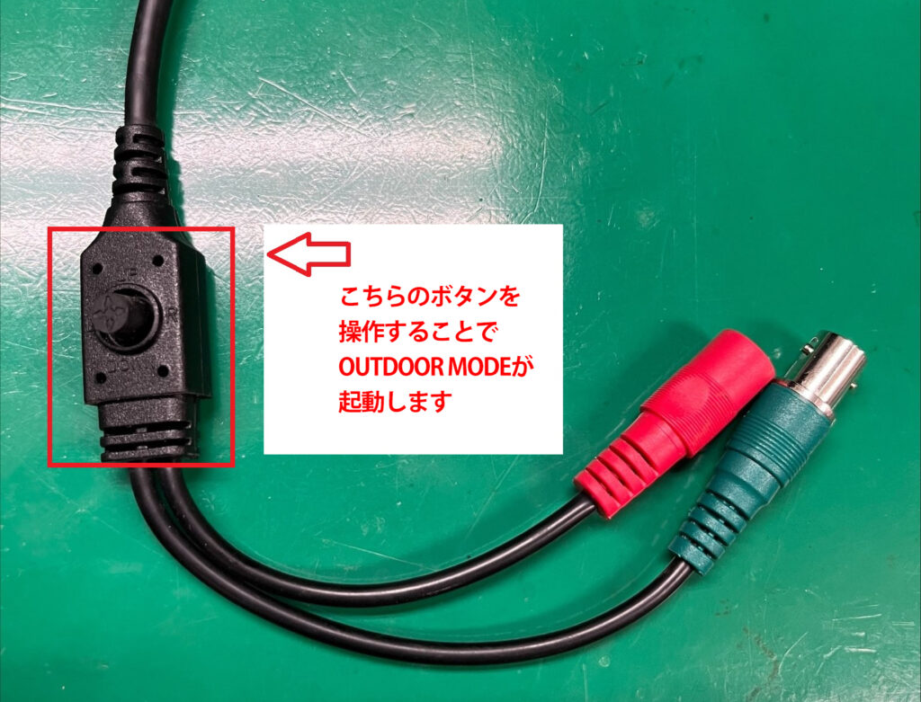 カメラ側から出ているケーブルのOSDスイッチを押すことでOUTDOOR MODEが表示されます。このモードを終了させる場合はカメラ側の電源を一度抜いて、繋ぎ直してください。