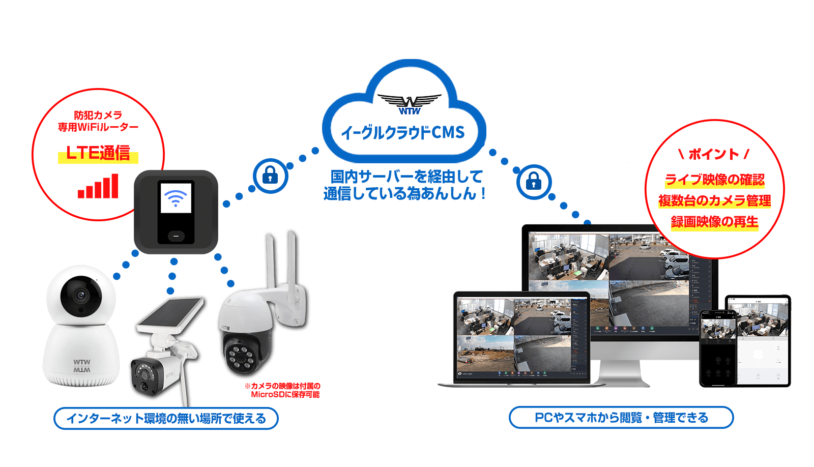 イーグルWiFiを利用すれば、インターネット環境の無い場所でも、防犯カメラを設置して遠隔から映像を確認することができます。