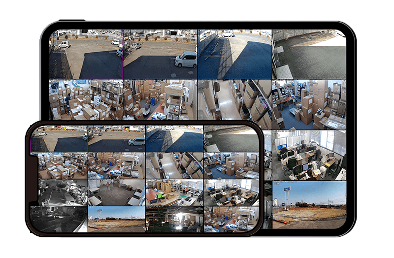 iPhoneやiPadでも分割画面で最大16台のカメラを同時に閲覧することができます。