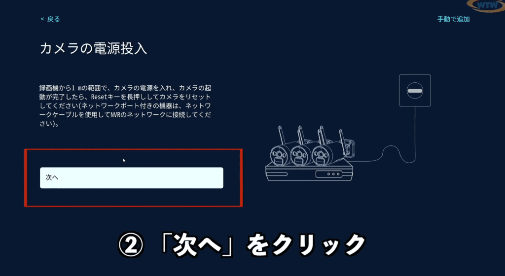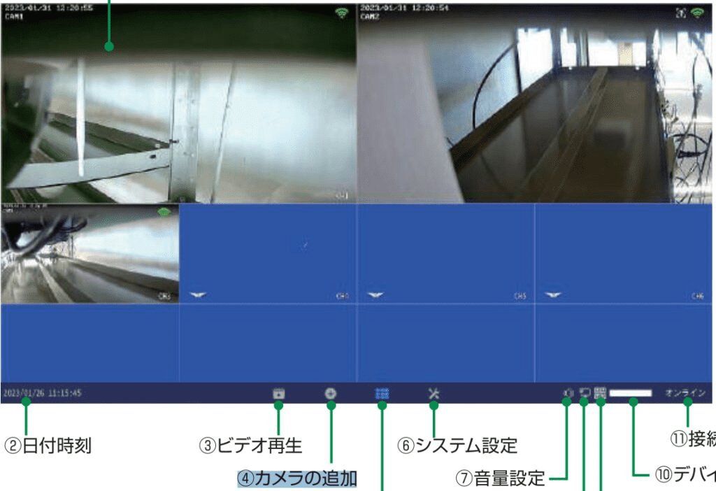 2.録画機のデバイス画面で④の「カメラの追加」をクリックする。