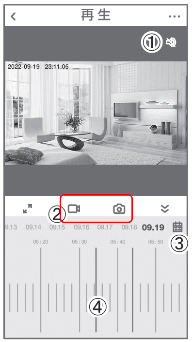 ①録画データを再生しながらビデオまたはカメラのアイコンをタップしますビデオアイコン→動画で保存カメラアイコン→静止画で保存