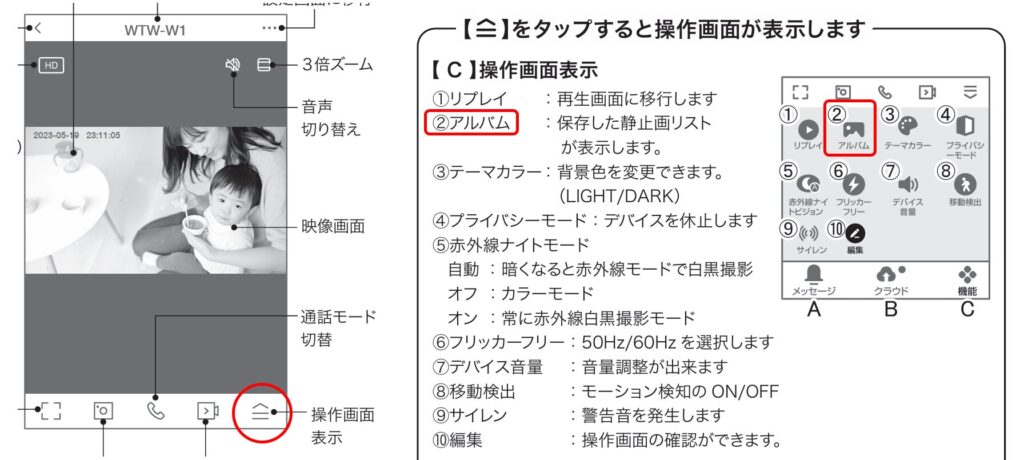 ②保存が終わったらライブ映像に戻って「アルバム」をタップすることで手動で保存したデータを確認します