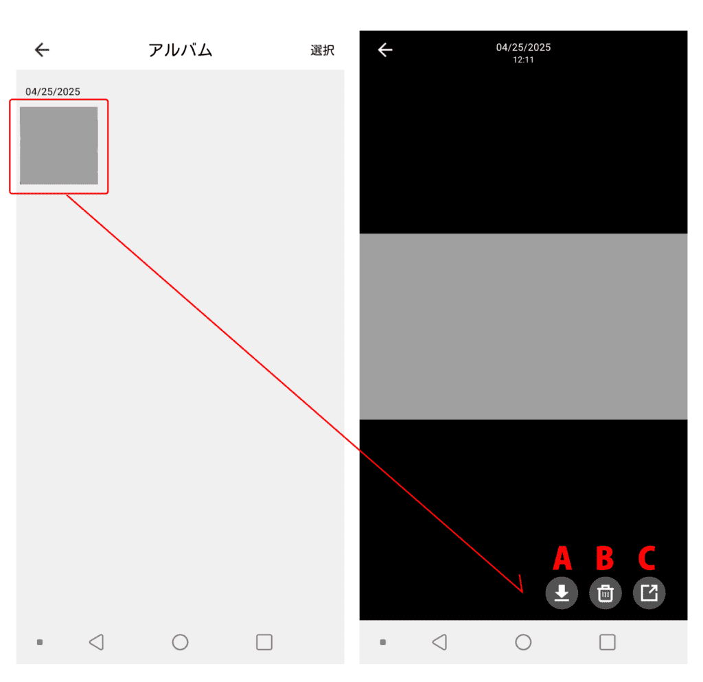 ③アルバムから保存したいデータをタップして各操作を行いますA→端末へ保存B→アルバムから削除C→LINEアプリやメールなど外部アプリを使用して転送