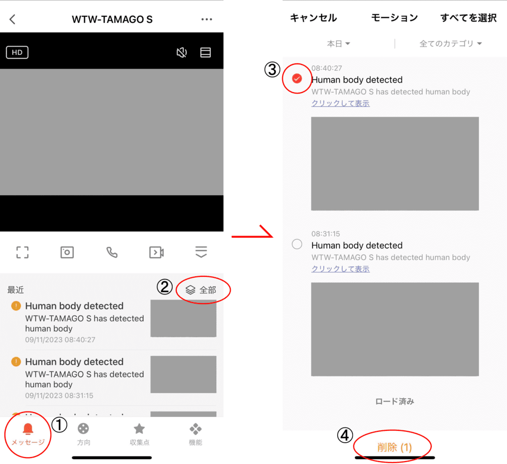 SmartLifeアプリ内の動きを検知したメッセージを削除する場合は下記の手順をご確認ください。