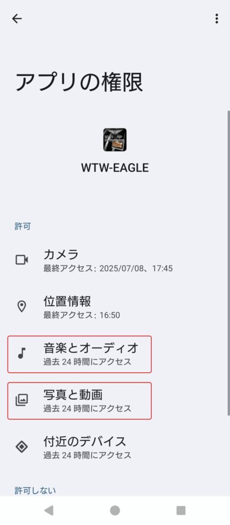 Androidスマホの機種によっては【音楽とオーディオ】【写真と動画】両方を許可しないとアルバムの許可がオンにならない場合があるためオンにならない場合はAndroidスマホの設定をご確認ください。