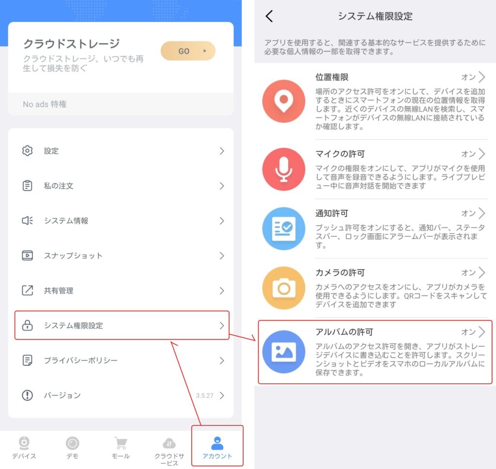 アルバムの許可がオフになっている場合はスマートフォンへ録画したデータを保存する時や、ライブ映像を見ながら手動で撮影した時にエラーメッセージが表示される場合があります。