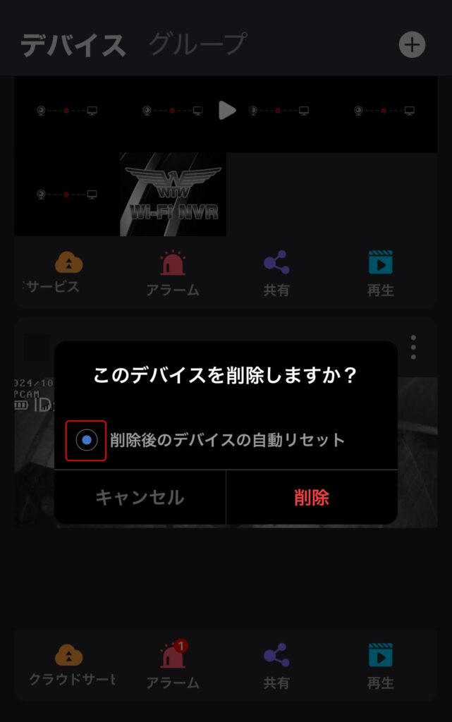 ※「削除後のデバイスの自動リセット」にチェックを入れた場合はカメラの初期化も同時に行います。デバイスをリセットしない場合はチェックを外した状態で【削除】をタップしてください。