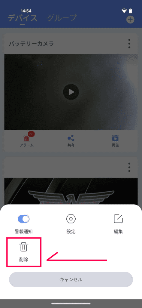 ③「削除」を選択します。削除完了後、カメラをリセットし再設定をお願いいたします。