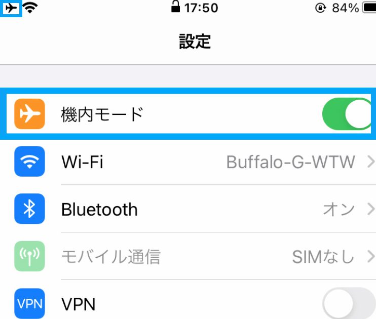 画面左上に機内モードアイコン(飛行機)が表示されるとOK