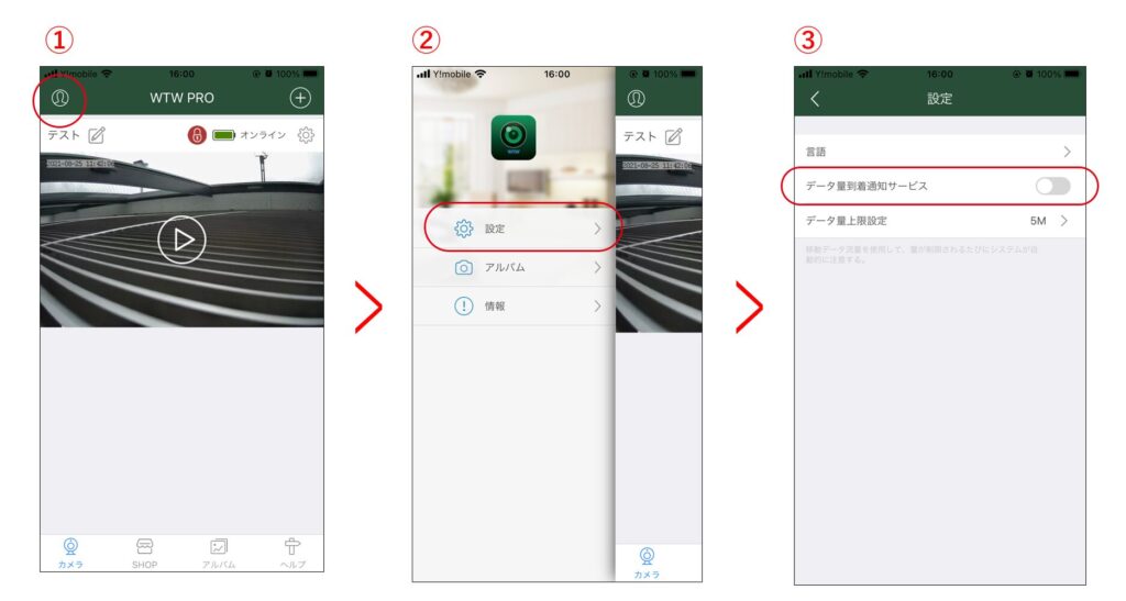 画像①~③の手順に沿って「データ量到達通知サービス」をOFFにすることで表示は止まります。