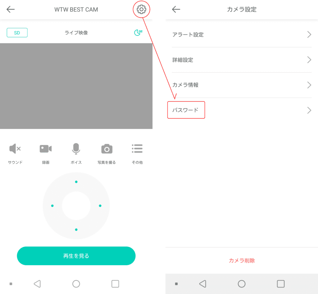 ■パスワード設定方法カメラのライブ映像右上の歯車アイコンをタップしますカメラ設定の「パスワード」をタップします※iOS、Android版で表記が異なります