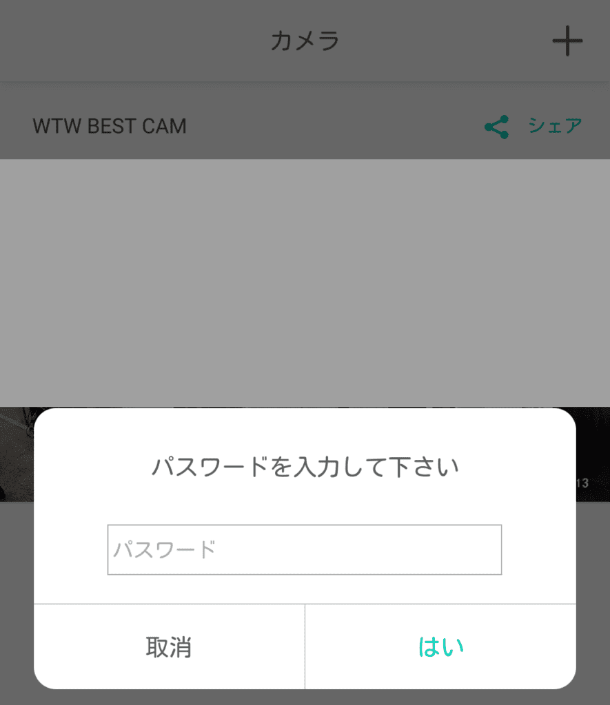 カメラにパスワードを設定した場合アプリ内でカメラにアクセスする前にパスワードを入力させることができます(設定は任意)