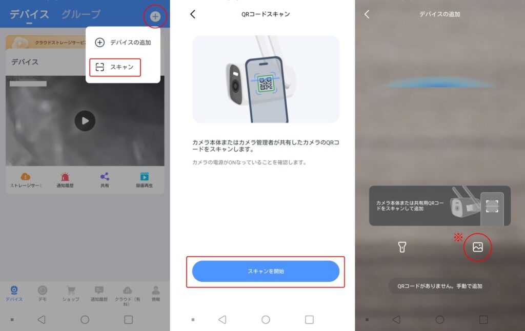 ※QRコードを直接読み込むことができない場合はQRコードが表示されている画面のスクリーンショットを端末に保存した状態で「デバイスの追加」画面の写真アイコンからスクリーンショットを読み込むことで登録ができます
