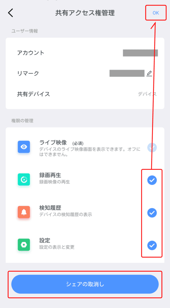④権限を変更する場合→権限の管理のチェックマークから変更した後「OK」をタップします