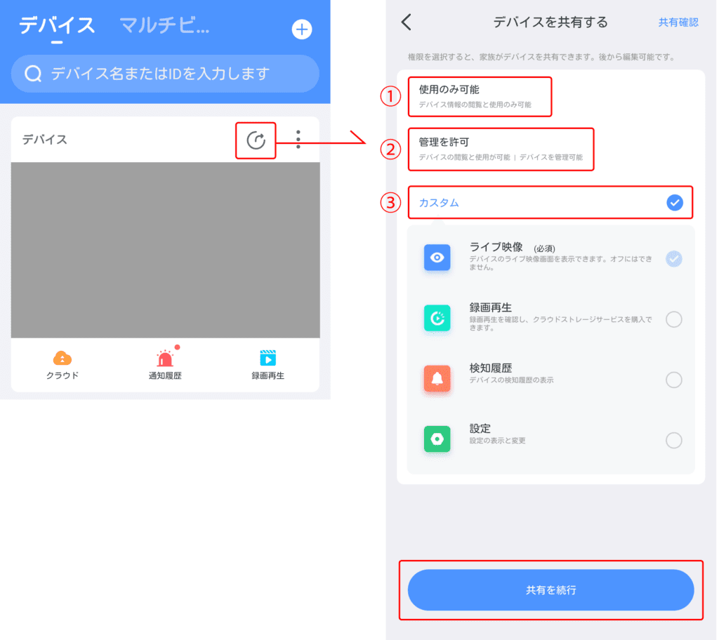 デバイス情報を共有する場合の操作方法は下記のとおりです
