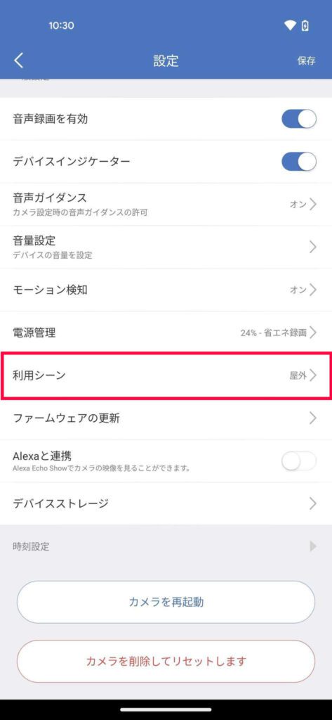 カメラの設定項目「利用シーン」は下記内容となりますのでご注意ください。
