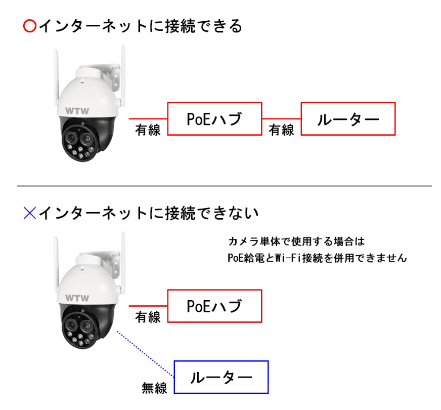 WTW-EX2208ZWをPoE給電した状態でルーターと無線通信ができません。カメラ単体でPoE給電をしていただく場合はハブとルーターを有線接続した状態でご使用ください。
