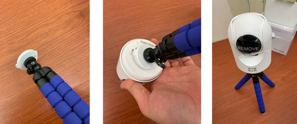 まず、フレキシブル三脚の先端にネジ穴付きのフタを取付けてください。フタが三脚に固定できたらカメラの底面にフタをはめ込む形で取付けてください。