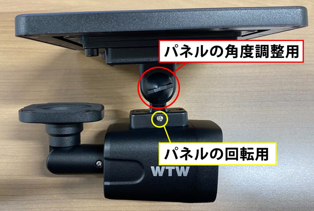 ソーラーパネルの角度を調整する場合はパネルの固定部分のつまみとネジを緩めてください。
