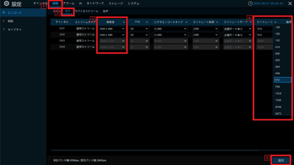 マウス操作より【設定】を左クリック➡️①【録画】のカテゴリーより【エンコード】を左クリック➡️②サブを左クリック➡️③解像度を640×480へ変更➡️④ビットレートを512へ変更➡️⑤【適用】を左クリックします。設定変更は以上になりますので、症状が改善されるか様子を見て頂きますよお願いいたします。