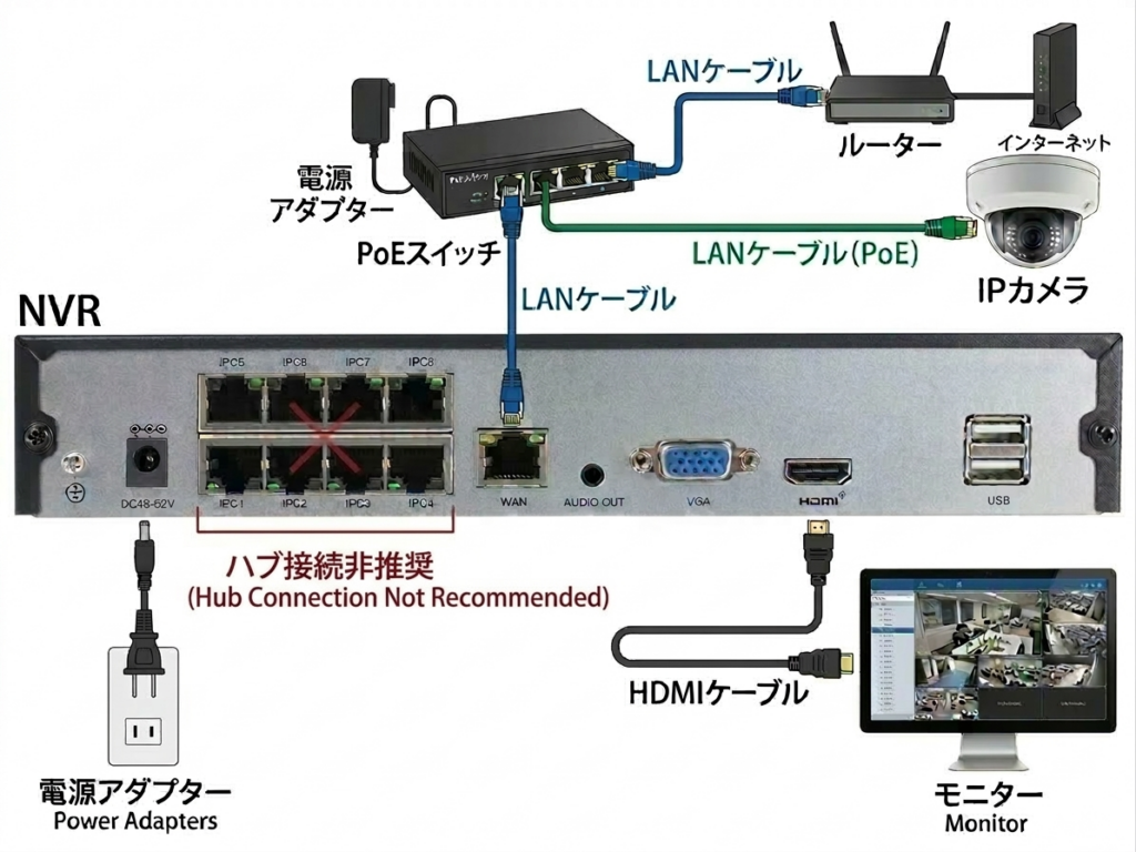 ※接続時の注意※LANポートへのPoEハブ接続は非推奨です。正常に動作しない場合がありますのでご注意ください。