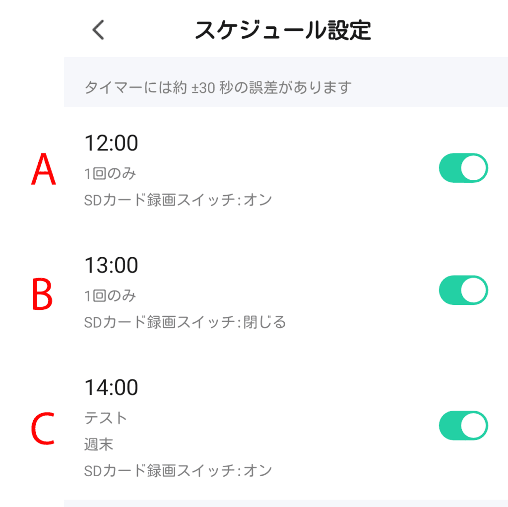 タイマー設定ではMicroSDカードへの録画のON/OFFをスケジュール登録することができます。