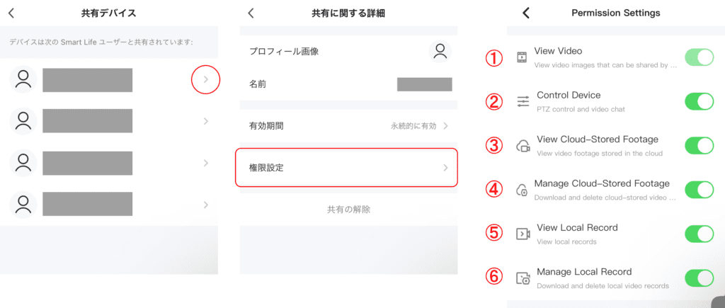 製品を他のスマートフォンへ共有した際、アカウント毎に権限を設定することができます。