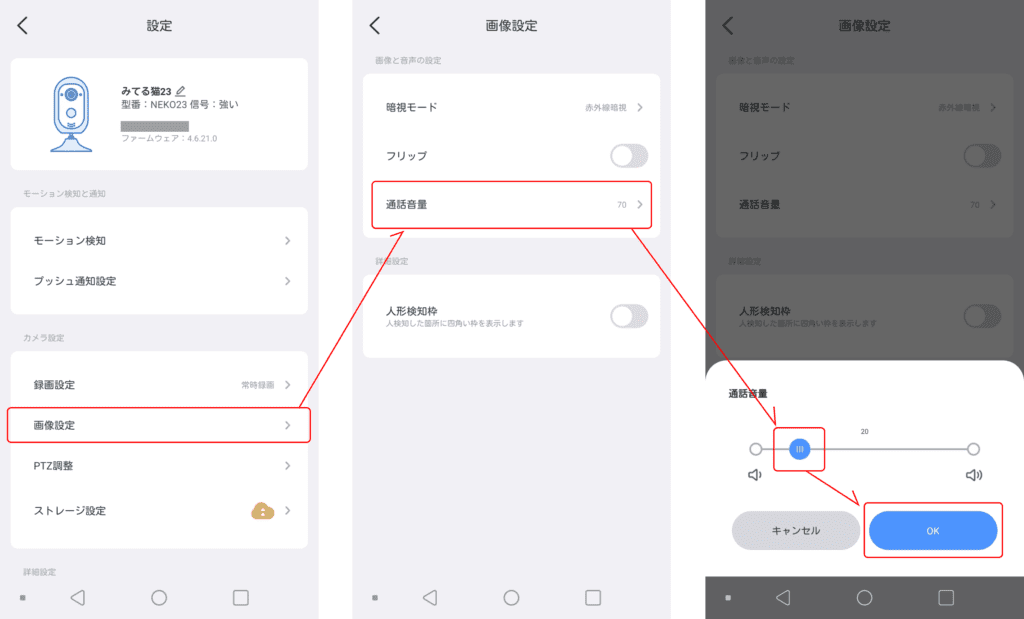 ①カメラの設定画面を開いてください②画像設定から通話音量を選択してください③通話音量を調整して【OK】をタップしてください