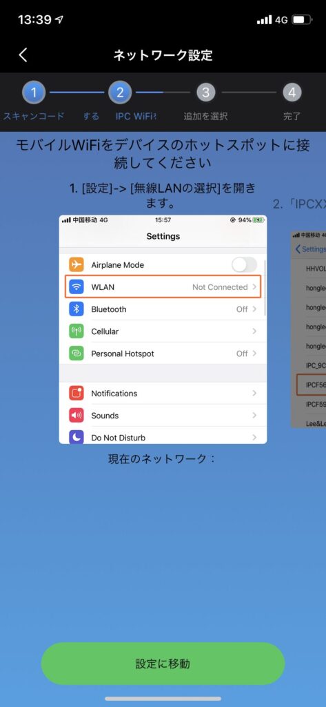 次のような画面が表示されたら、スマートフォンの設定へ進んで、WiFi設定から「IPC…」から始めるWiFi名(SSID)を選択してください。