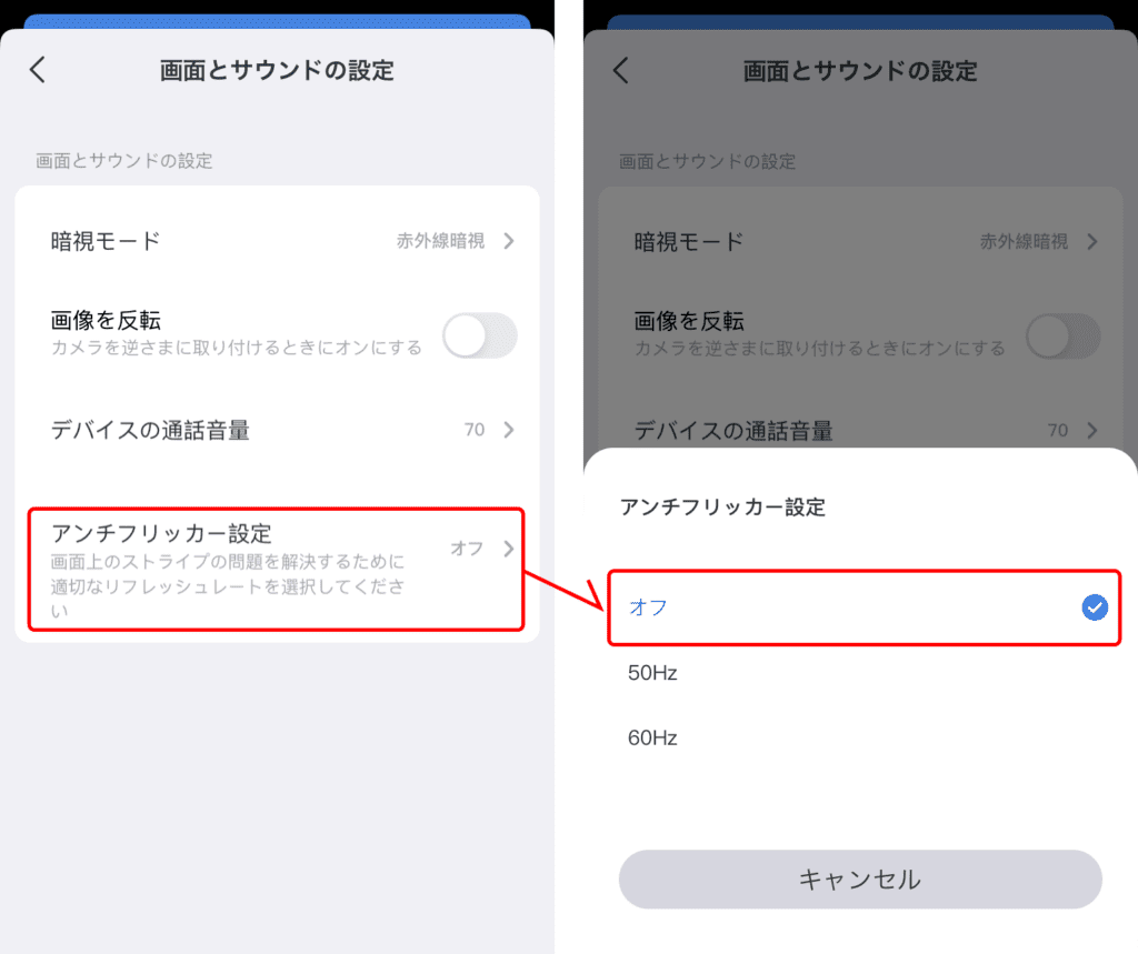 昼間の映像が真っ白に映り、夜間は正常に映っている場合はカメラのフリッカー機能がONになっている可能性があります。オフにする場合の操作方法につきましては下記の画像をご確認ください。