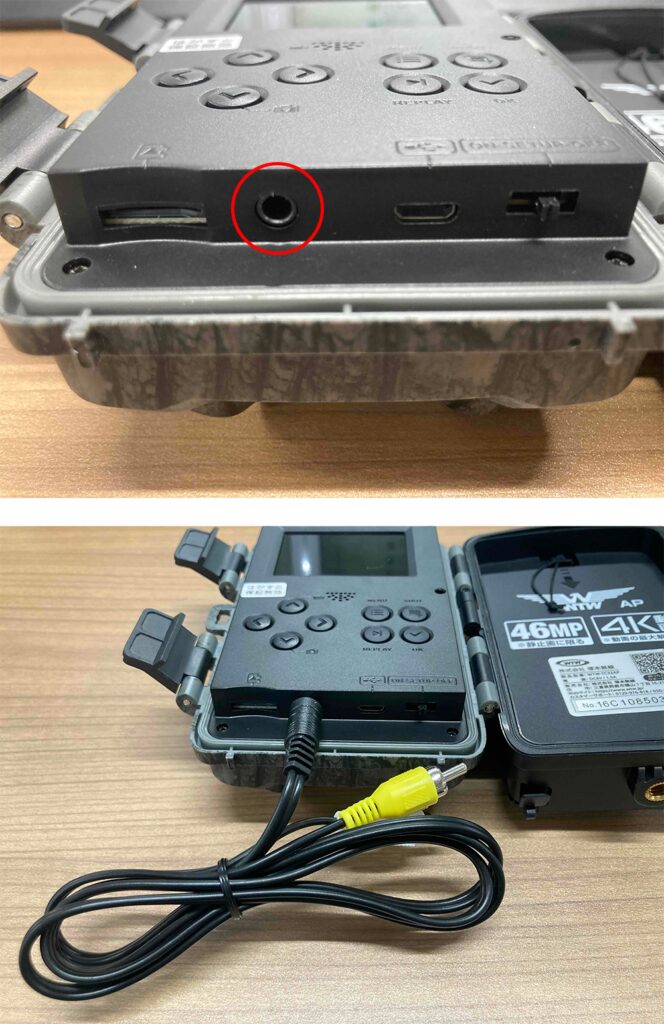 カメラを開けた状態でMicroSDカード差込口横にある差込口にAVケーブルを接続してください。