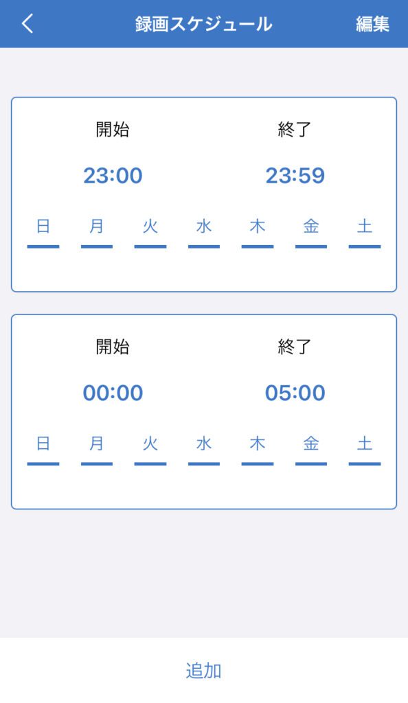 スケジュール録画管理で「開始23:00~終了07:00」など曜日を超える設定にしたい場合は画像のように2つに分けて録画の設定を行ってください。
