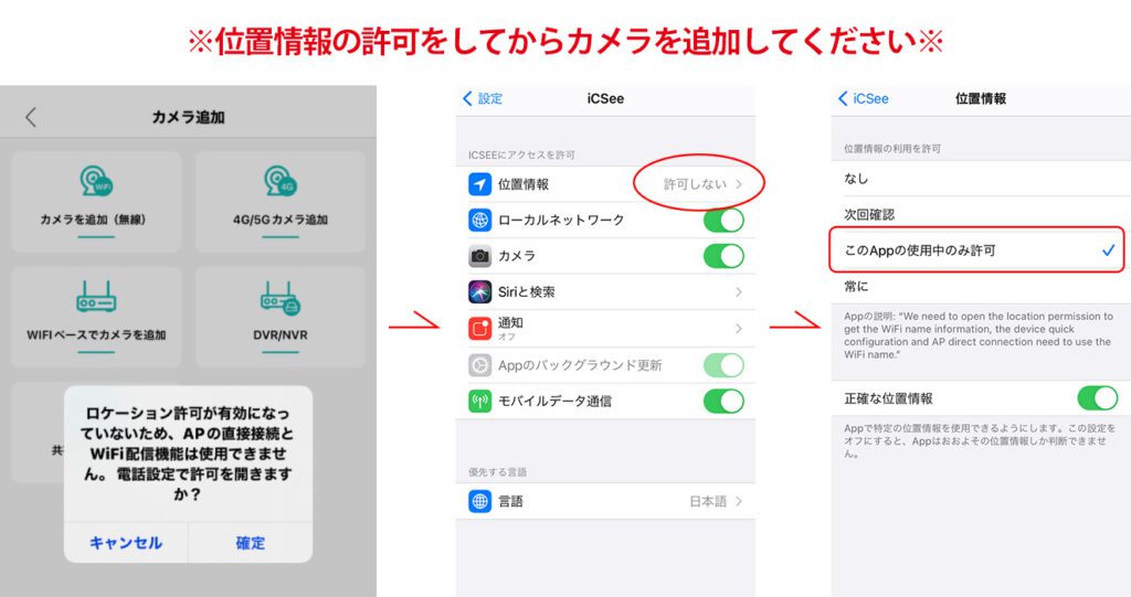 カメラを追加しようとした時に『ロケーション許可が有効になっていない』というメッセージが出る場合はiCSeeアプリに位置情報の許可を設定してから操作をお願いいたします。