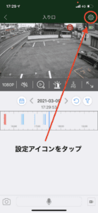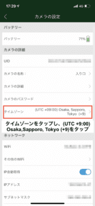 カメラ画面右上の「設定」アイコンをタップし、カメラ詳細のタイムゾーンをタップします。