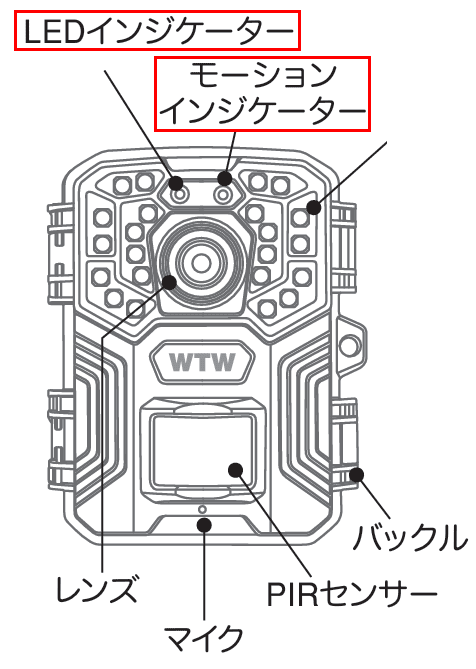 ■モーションインジケーターカメラのスイッチがTEST状態でPIRセンサーが検知した時に発光しますセンサーが検知していない時や撮影時は消灯状態になります