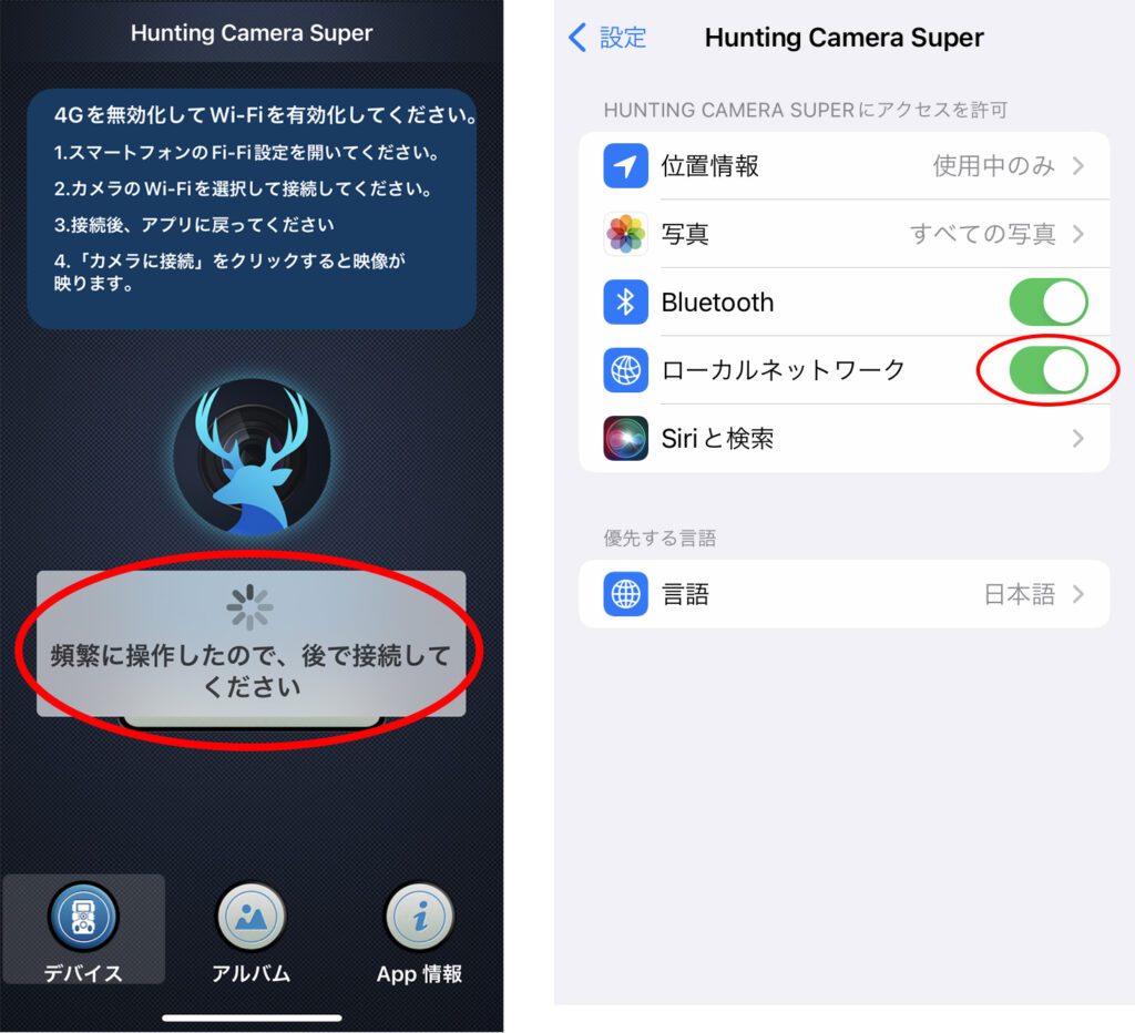 HuntingCameraSuperアプリでカメラに接続した時に「頻繁に操作したので、後で接続してください」というメッセージが出ている場合はスマートフォンの設定画面でアプリのローカルネットワークをONにした状態でもう一度接続をしてください。