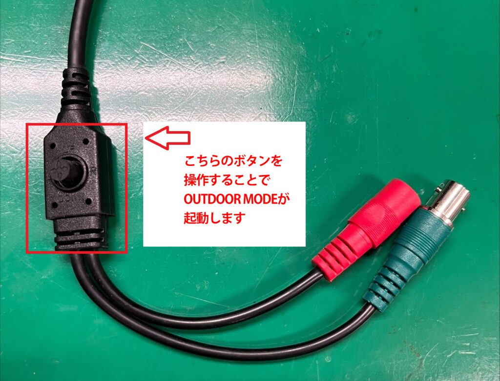 カメラ側から出ているケーブルのOSDスイッチを押すことでOUTDOOR MODEが表示されます。