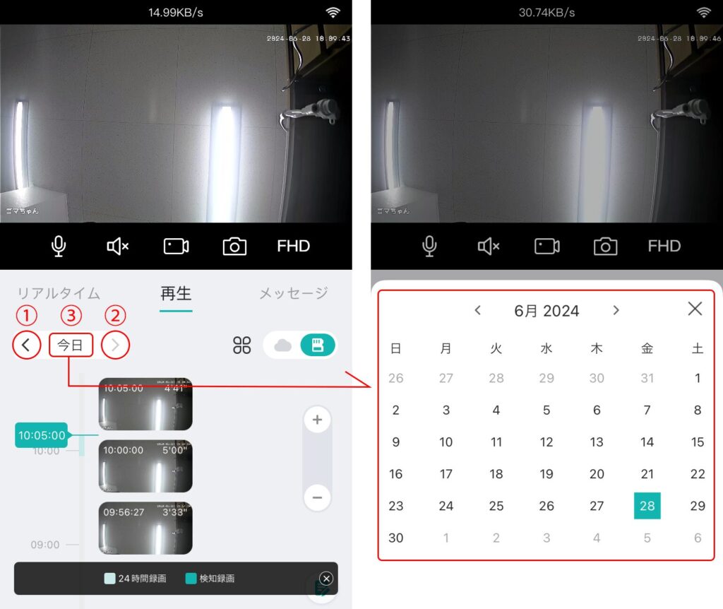 ①をタップすると前日の録画データが表示されます②をタップすると翌日の録画データが表示されます③をタップすると当月のカレンダーが表示されます