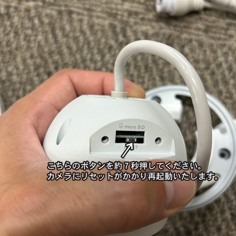 カメラのリセットを行う際はリセットボタンを約7秒間押してください。