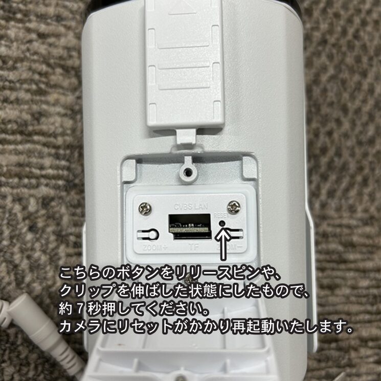 カメラのリセットを行う際はリセットボタンをリリースピンやクリップを伸ばしたもので約7秒間押してください。
